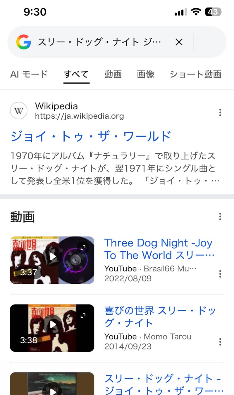 早速、Googleアプリの音楽検索機能に挑戦してみました。頭にふと浮かんだスリードッグナイトの「喜びの世界 (JOY TO THE WORLD)」で”勝負”です!
